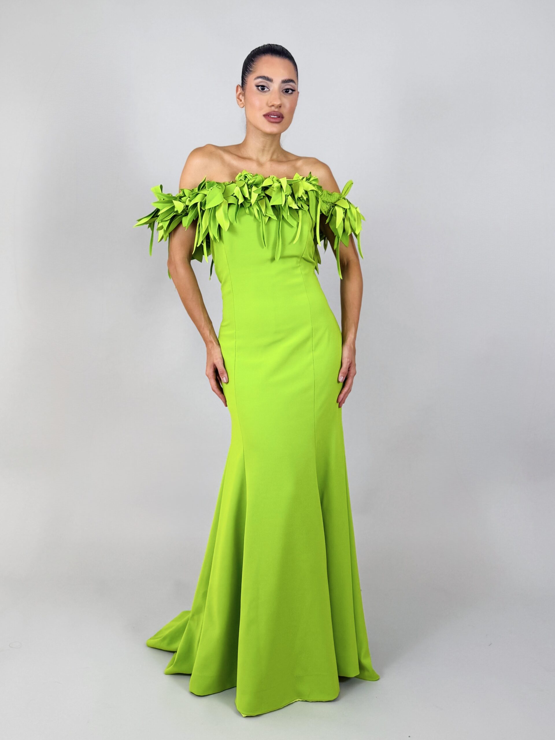 Vestido longo sereia com flores ombro a ombro verde limão