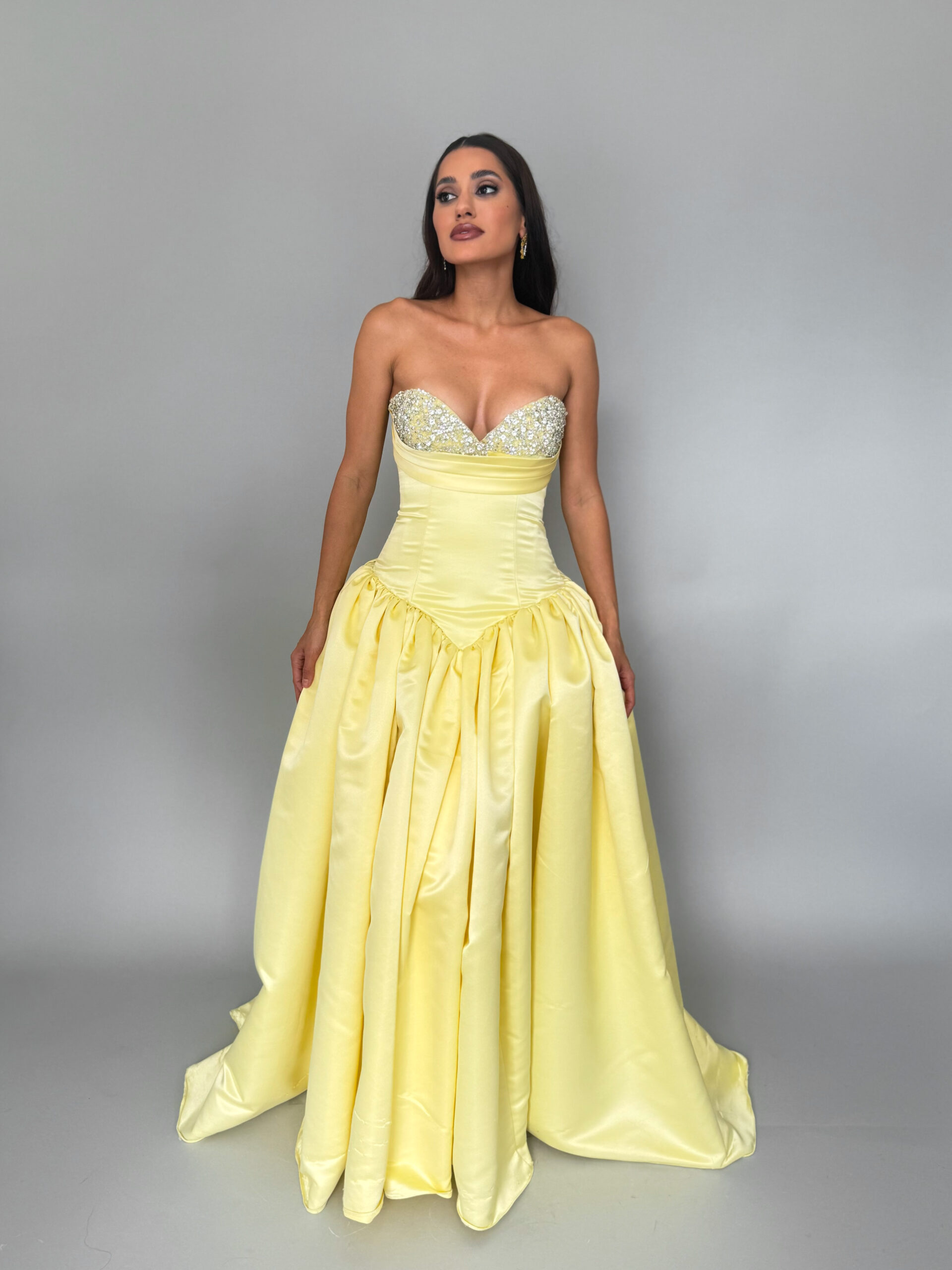 Vestido longo com busto bordado, cintura baixa e saia volumosa