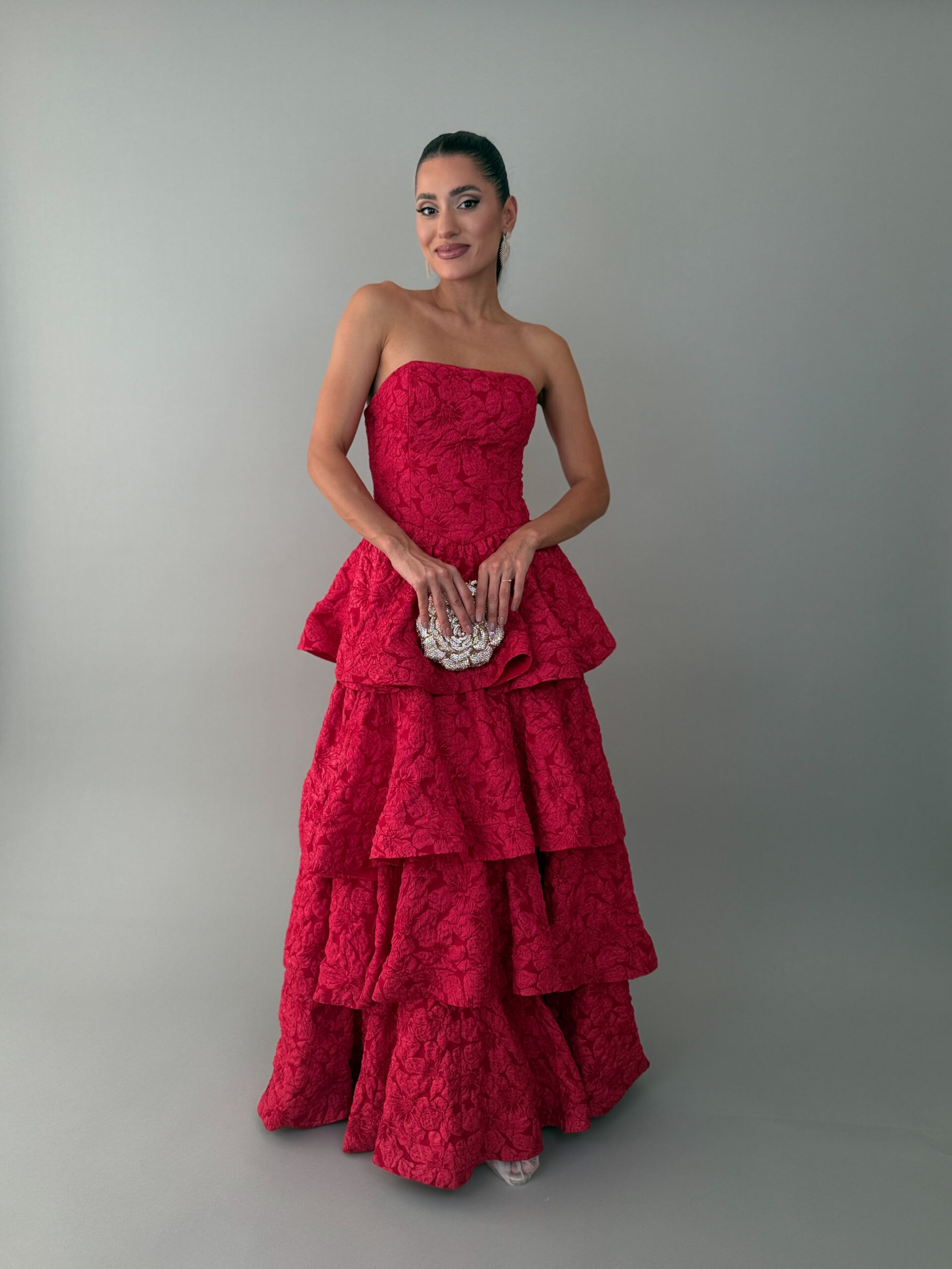 Tags: babados, jacquard, tomara que caia, vermelho, vestido, vestido longo