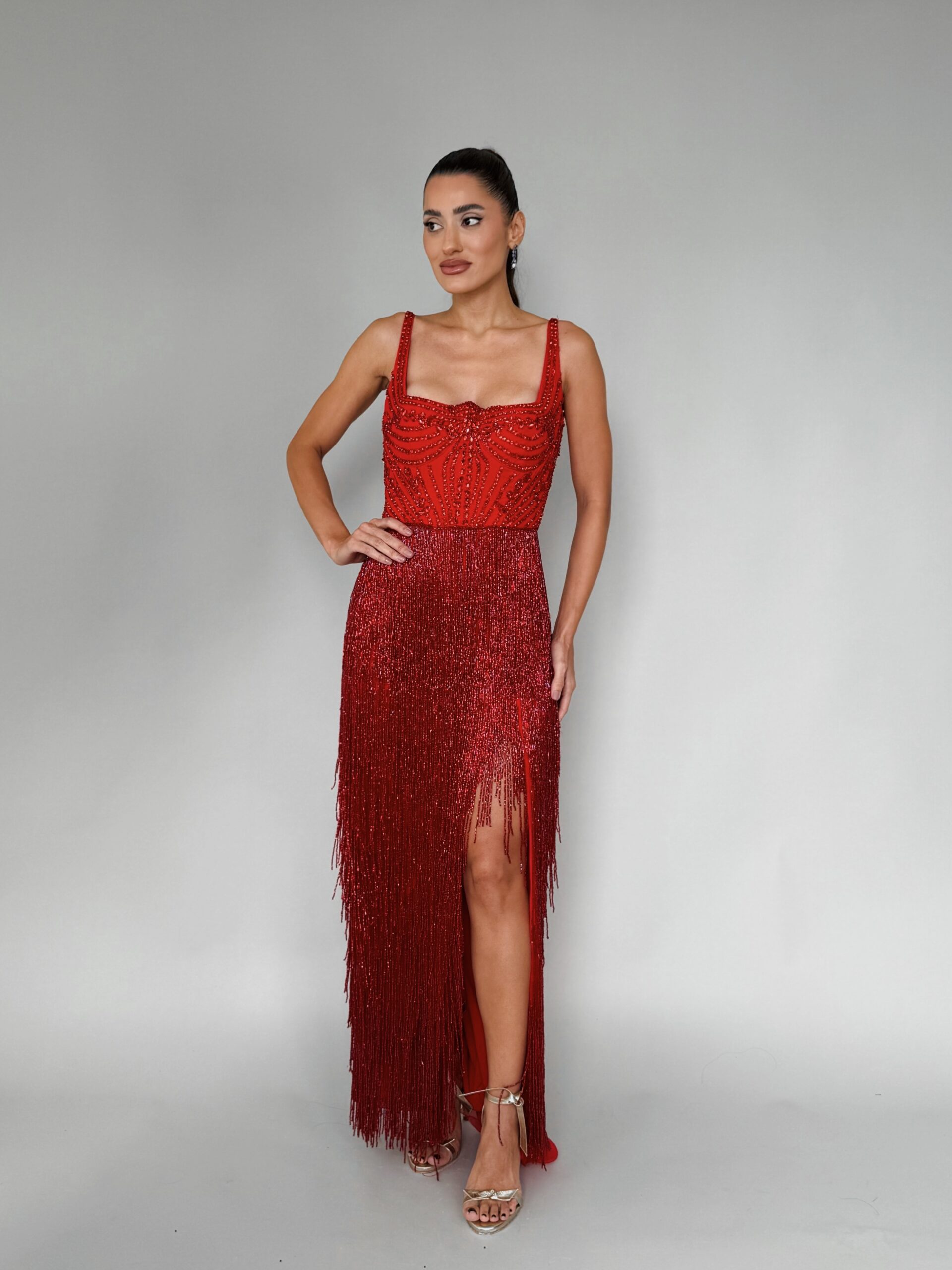 Vestido longo bordado com franjas em vermelho