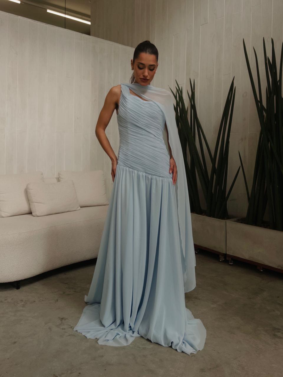 Vestido assimetrico com detalhe de drapeado na parte superior com manga única e ciumento fluido. Vestido usado por Grace Kelly no filme: O ladrão de casaca