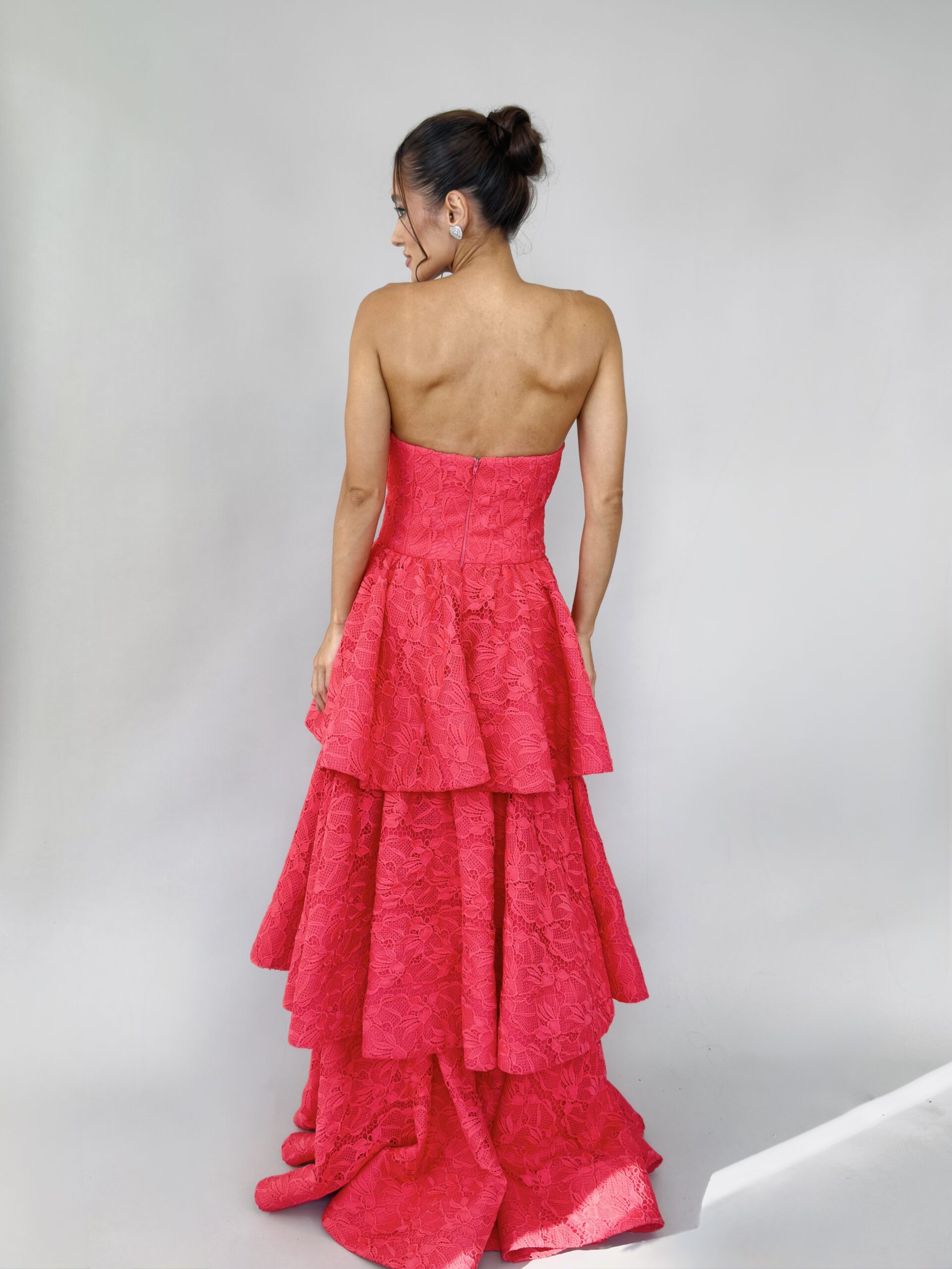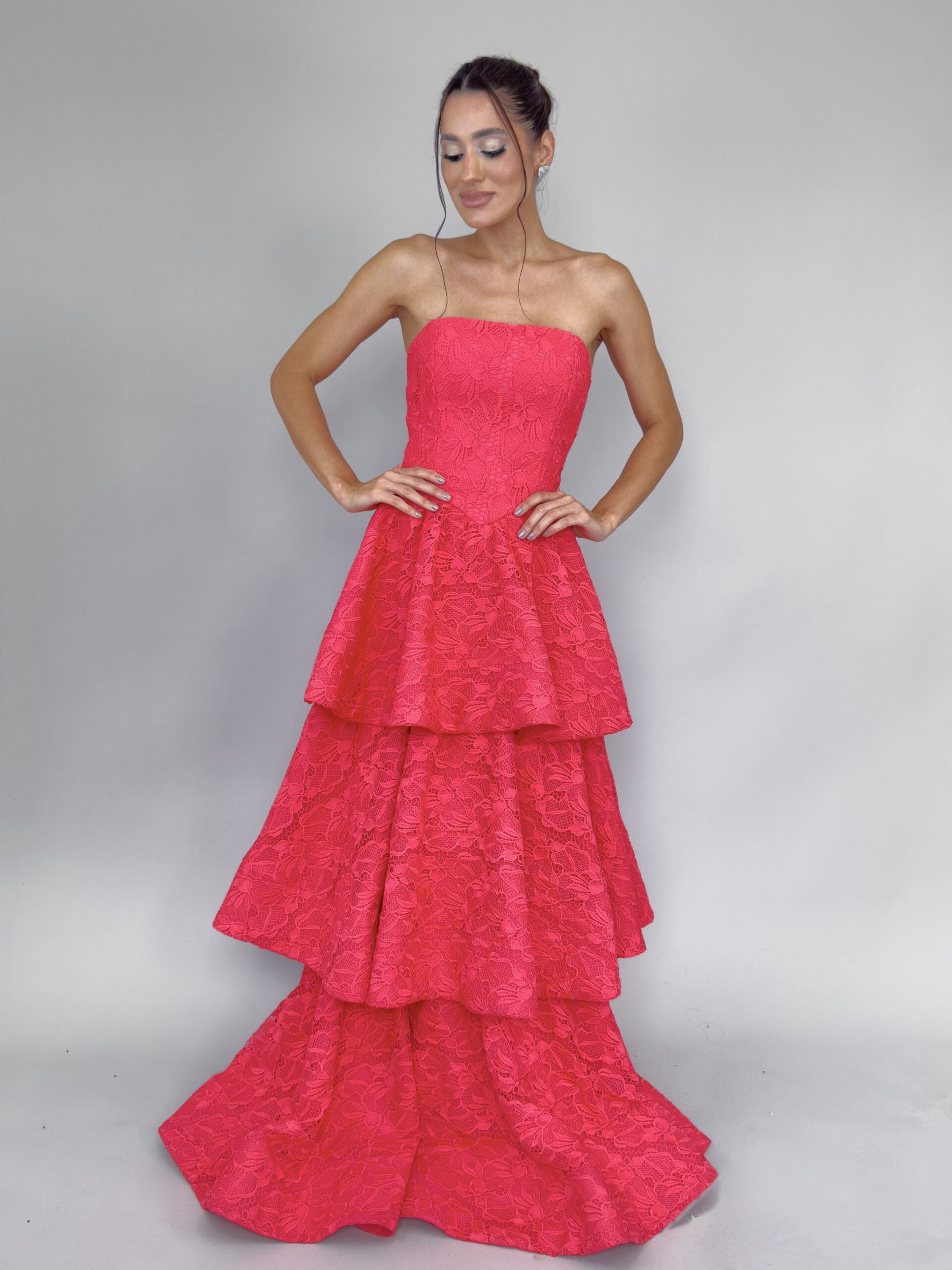 Vestido longo com camadas em renda coral